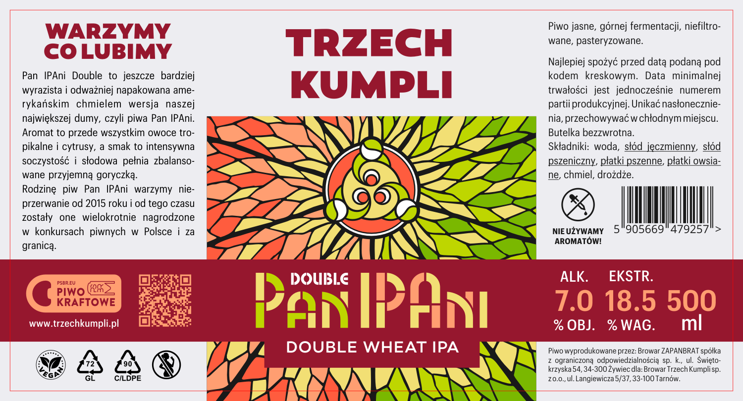 Double Wheat IPAPodobnie jak w pojedynczej wersji Pan IPAni pierwsze skrzypce gra tutaj amerykański chmiel połączony z dużą ilością słodu pszenicznego i płatków pszennych. Nadają one piwu krągłości, kremowości i lekkości w odbiorze. Piwo nie zdradza swojej mocy alkoholowej, a gorycz jest umiarkowana i bardzo cytrusowa.