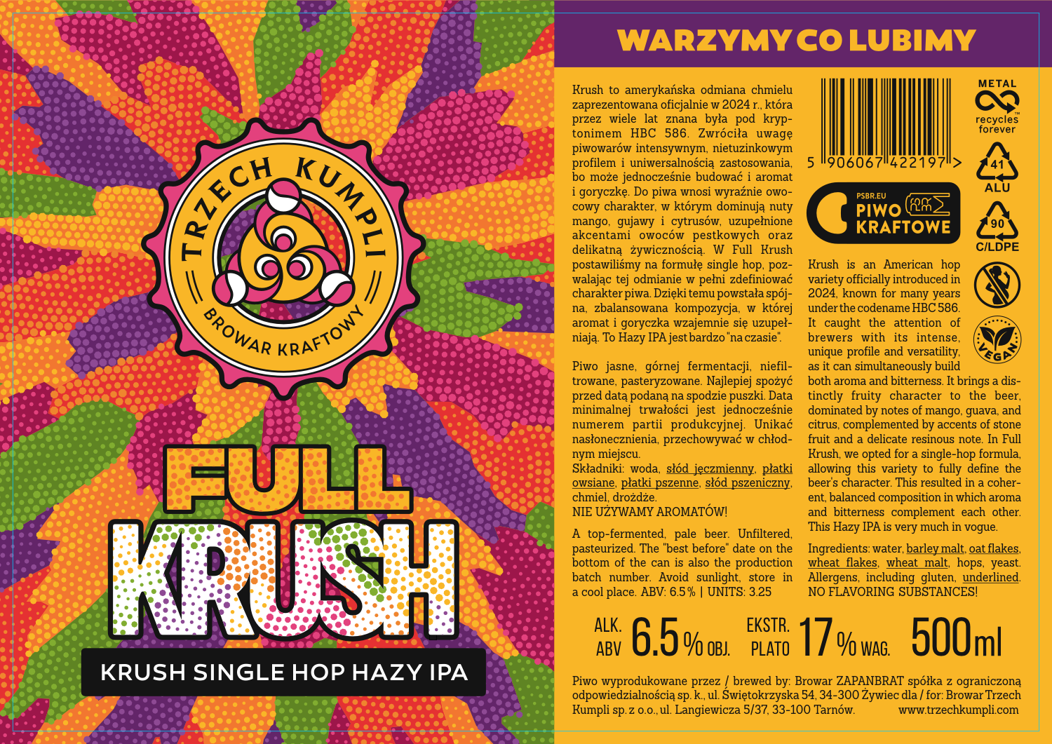 W Full Krush postawiliśmy na formułę single hop, pozwalając tej odmianie w pełni zdefiniować charakter piwa. Dzięki temu powstała spójna, zbalansowana kompozycja, w której aromat i goryczka wzajemnie się uzupełniają. To Hazy IPA jest bardzo „na czasie”.