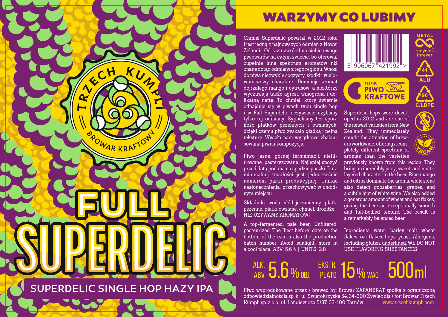 Wnosi do piwa niezwykle soczysty, słodki i wielowarstwowy charakter. Dominuje aromat dojrzałego mango i cytrusów, a niektórzy wyczuwają także agrest, winogrona i delikatne nuty nafty. To chmiel, który świetnie odnajduje się w piwach typu single hop i w Full Superdelic oczywiście użyliśmy tylko tej odmiany. Sypnęliśmy też sporą ilość płatków pszennych i owsianych, dzięki czemu piwo zyskało gładką i pełną teksturę. Całość uzupełnia łagodna i przyjemna goryczka, która podkreśla soczystość profilu chmielowego.