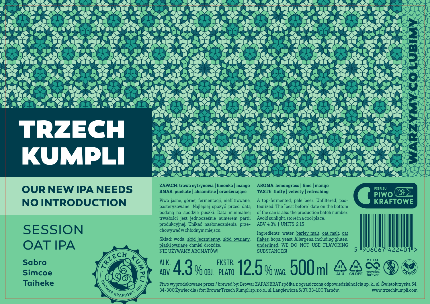 Session Oat IPAKróciutko: 12,5% ekstraktu i 4,3% alk. – lekkie, sesyjne IPA z wyraźnym udziałem słodu owsianego (23%!) i płatków owsianych, które odpowiadają za jedwabistą teksturę i pełniejsze odczucie ciała.