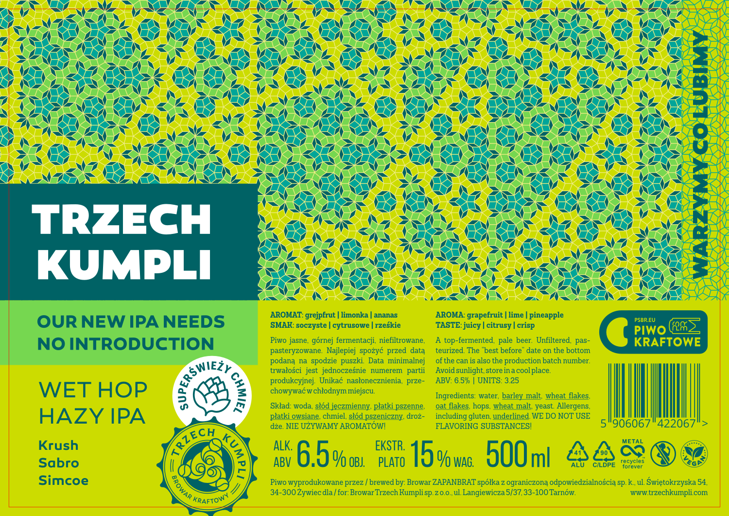 Użyte chmiele w formie niesuszonej dają szerokie spektrum cytrusowych i owocowych akcentów. Aromat wskazuje na nuty grejpfruta, limonki i ananasa. Słody wnoszą delikatną zbożową bazę i gładką teksturę, która dobrze współgra z tropikalnymi aromatami i niewysoką goryczką. Całość jest słodka w odbiorze i pełna chmielowych akcentów typowych dla “mokrego” chmielu.