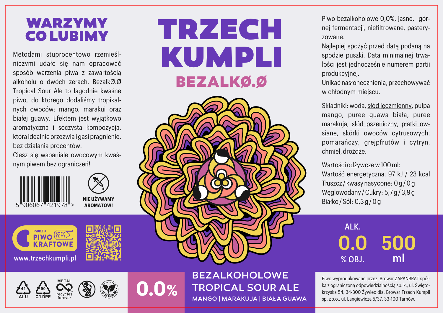Bezalkoholowe Tropical Sour AleBezalkØ.Ø Tropical Sour Ale powstało bez dróg na skróty – użyliśmy piwowarskich składników, przygotowanych na nasze specjalne zamówienie pulp i soków owocowych, a także świeżych skórek cytrusów, które zostały przyrządzonych na miejscu w browarze.
